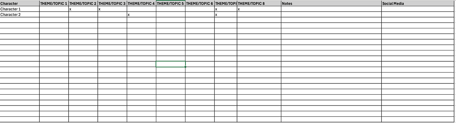 A spreadsheet with all interviewees listed vertically and thematic/story categories horizontally. Instead of looking for what fit my predetermined narrative, I checked off each person’s connection to themes like giving food, resistance, and art.